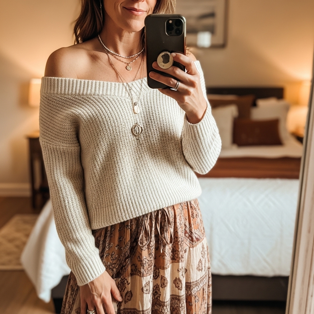 An off-shoulder sweater styled with a boho skirt creates a feminine and chic fall outfit. The sweater adds warmth, while the skirt keeps the look free-spirited. Pair with boots and layered jewelry to highlight the boho aesthetic. This outfit is ideal for brunch dates, fall gatherings, or casual evenings. Its relaxed yet polished charm makes it versatile and flattering, giving you a perfect balance of comfort and style.