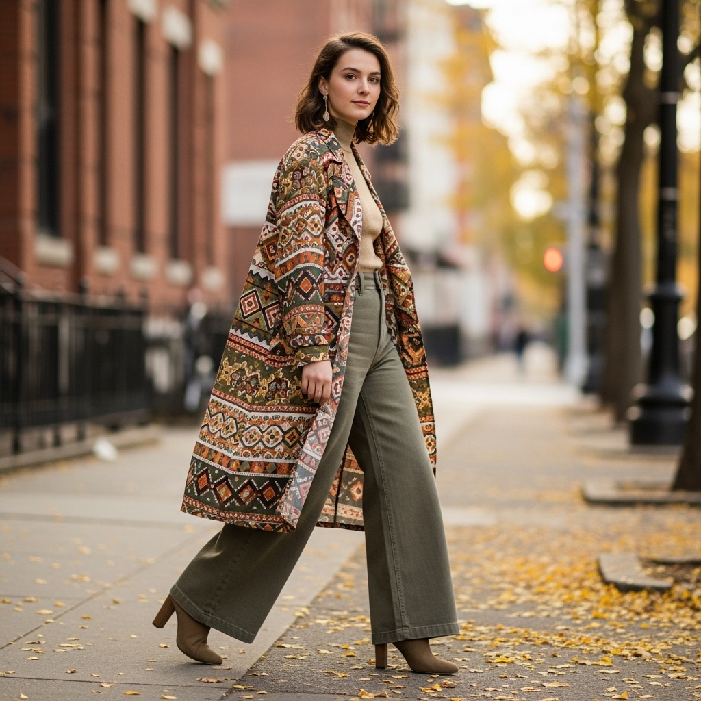 A dramatic duster coat layered over wide-leg pants creates a bold boho fall outfit. The flowing silhouette of both pieces adds movement and depth. Pair with heeled boots for added height and confidence. This look works well for city strolls, dinners, or even casual work environments where you can showcase personal style. The duster coat adds instant elegance while maintaining that laid-back boho spirit that’s perfect for autumn.