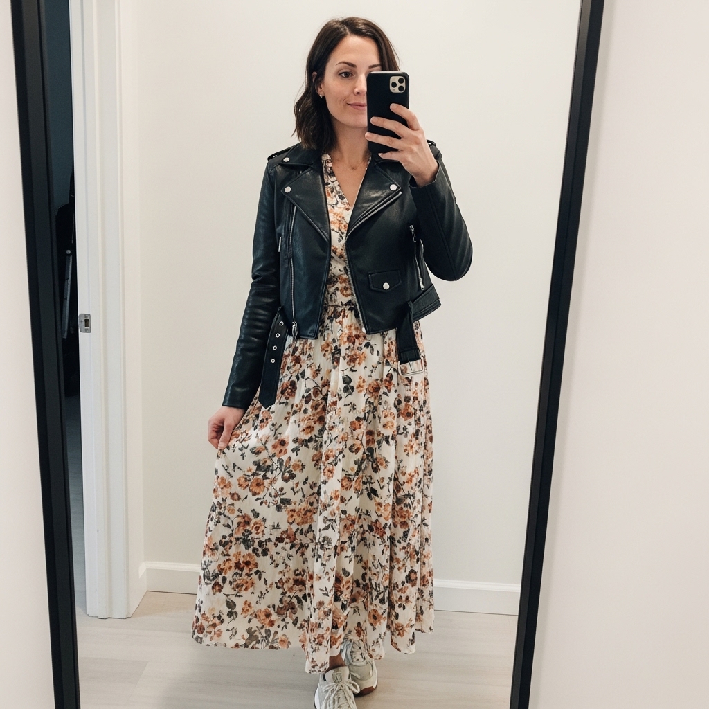Mixing a soft, flowy floral dress with a leather jacket creates an edgy boho look perfect for fall. The contrast between the delicate dress and structured jacket balances femininity with toughness. Pair with ankle boots or sneakers depending on the vibe you want. This outfit is versatile enough for daytime outings or casual nights out. It’s the ultimate mix of free-spirited boho energy and modern edge.