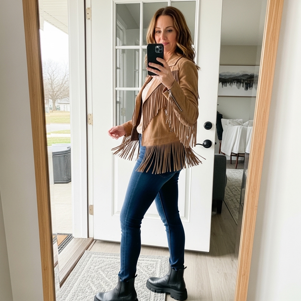 A suede fringe jacket is an iconic boho staple that never goes out of style. Pairing it with skinny jeans and a simple top allows the jacket to take center stage. The movement of the fringe brings playfulness, while suede provides a cozy fall texture. Finish the outfit with ankle boots or chunky heels. It’s a statement look that works well for casual outings, music festivals, or even evening strolls.