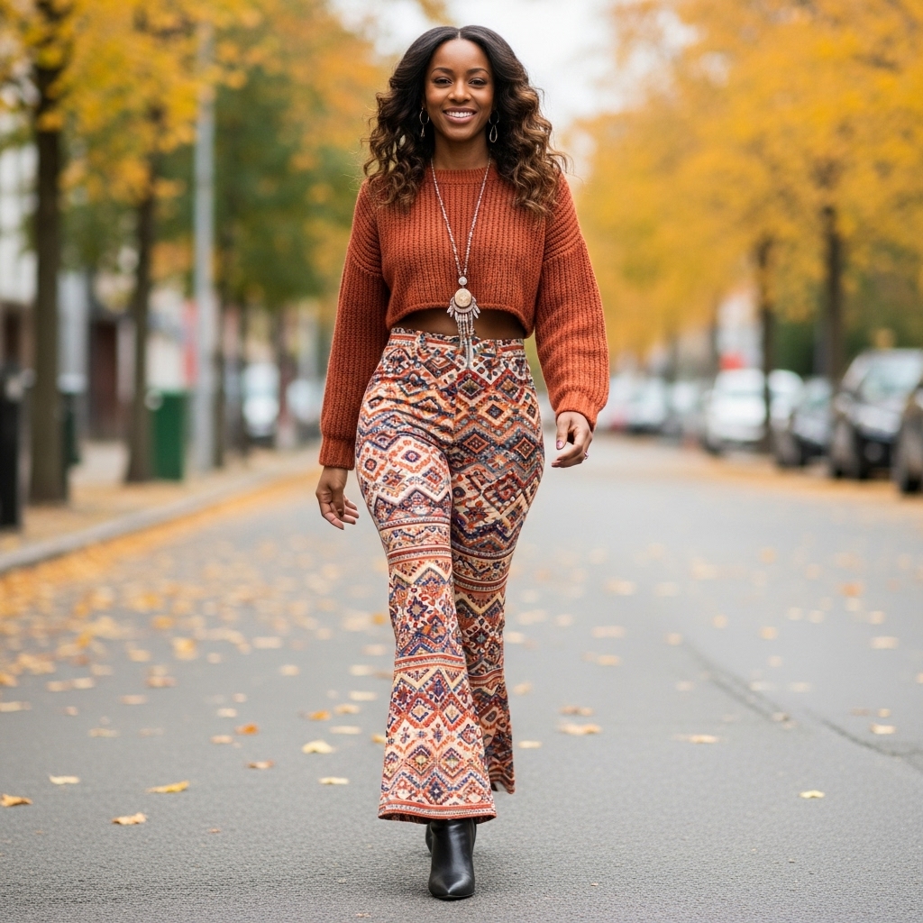 Flared pants are a must-have in any boho-inspired wardrobe, especially for fall. Style them with a cropped sweater to balance proportions and highlight your waist. Printed flares bring a bold retro energy, while solid earthy tones offer a subtle, versatile vibe. Add block-heeled boots to elongate your legs and give the look more definition. This outfit is ideal for casual workdays or weekend adventures where comfort meets vintage chic.