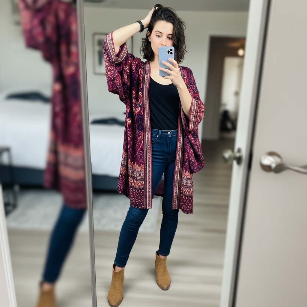 A patterned kimono adds effortless boho flair to even the simplest outfit. Throw it over skinny jeans and a plain top, and you instantly look chic yet relaxed. Kimonos with deep jewel tones or earthy shades work beautifully in autumn, making them versatile layering pieces. Pair with suede boots for a polished touch. This outfit is ideal for transitional weather when you want light layering without heavy coats.