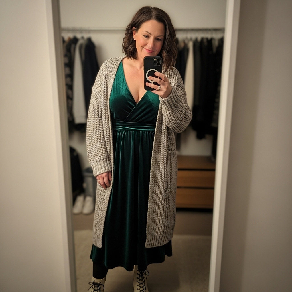 Velvet dresses in rich jewel tones like emerald, burgundy, or navy bring a touch of luxury to boho fall fashion. Pairing a velvet dress with a long cardigan softens the richness while keeping the look cozy and layered. Add lace-up boots for a romantic finishing touch. This outfit is perfect for evening outings, fall date nights, or festive gatherings, blending glamour with effortless comfort in true bohemian spirit.