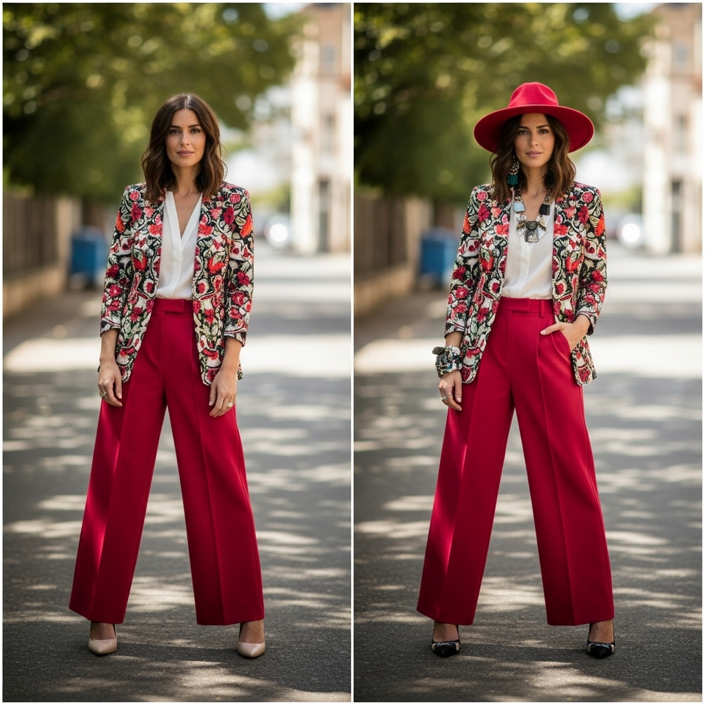 A patterned or embroidered blazer paired with wide-leg pants creates a polished boho look with personality. The blazer adds structure, while the flow of the pants keeps it relaxed and free-spirited. Style it with simple tops and heeled boots for extra sophistication. This outfit is perfect for creative workplaces, casual Fridays, or dinner nights. It balances elegance and bohemian charm without feeling too formal or too casual.