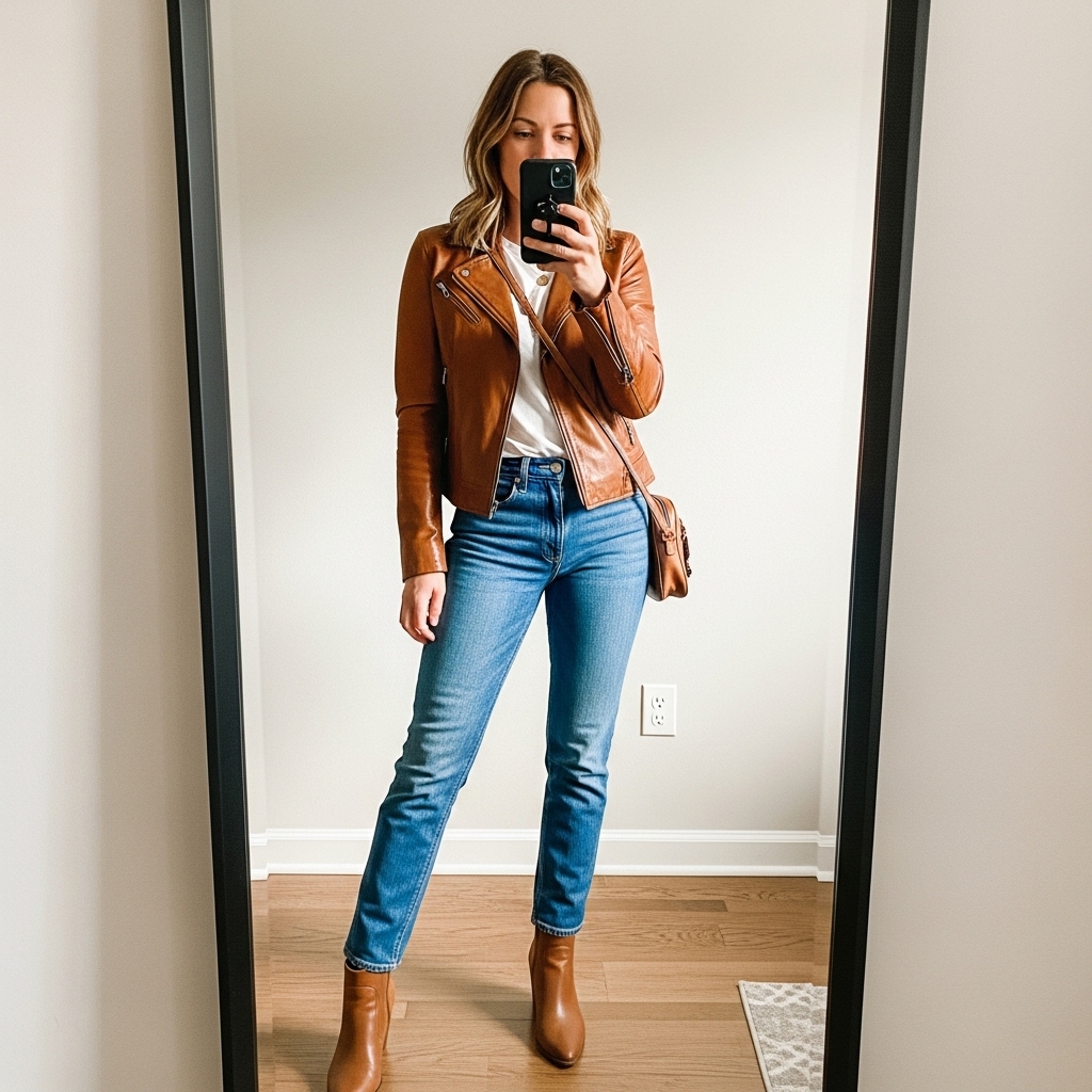 Pairing a brown leather jacket with classic denim jeans is a timeless fall combo. The deep leather tones add edge, while denim keeps the look casual. Style with ankle boots and a crossbody bag for city-ready vibes. This outfit works perfectly for coffee dates, weekend strolls, or casual fall evenings.