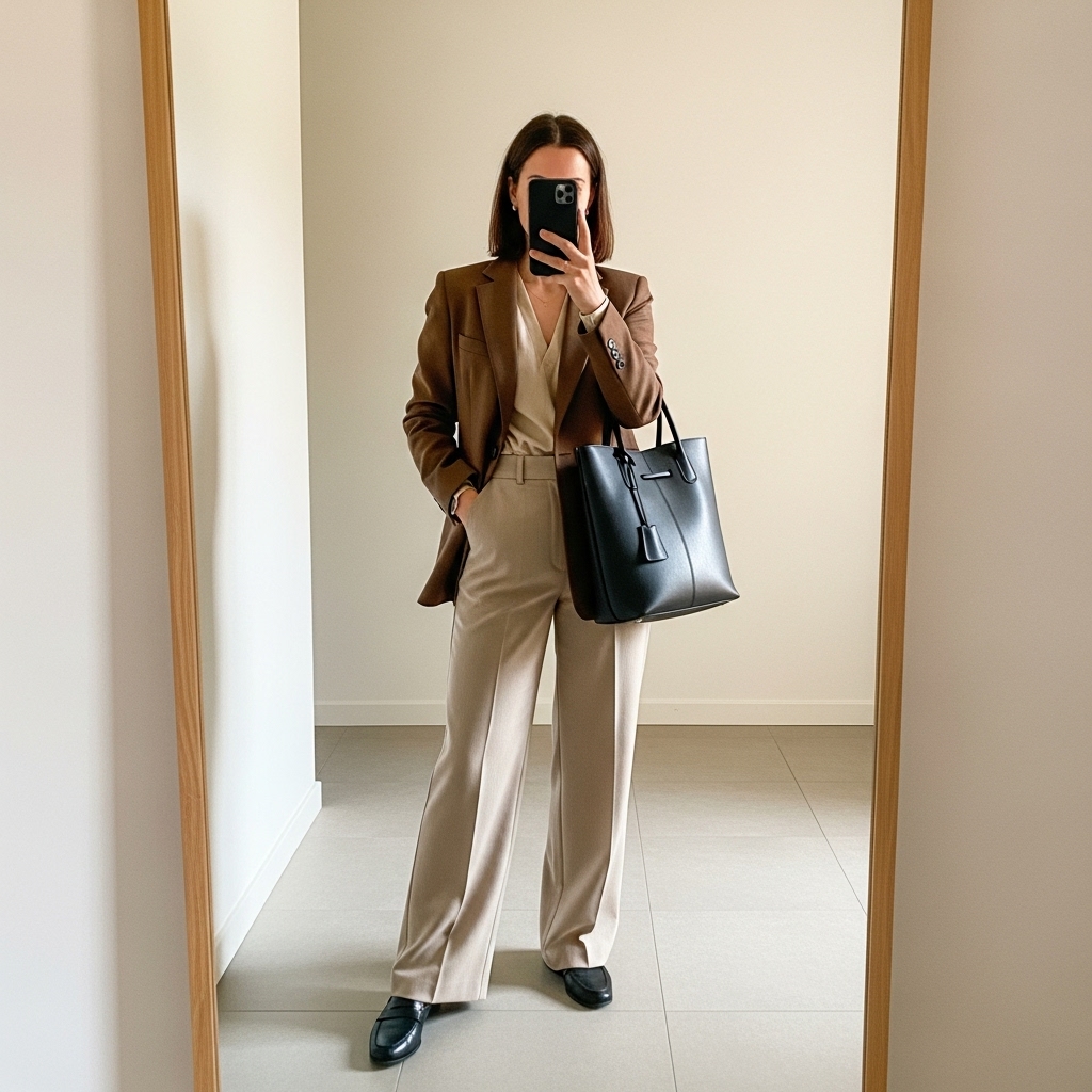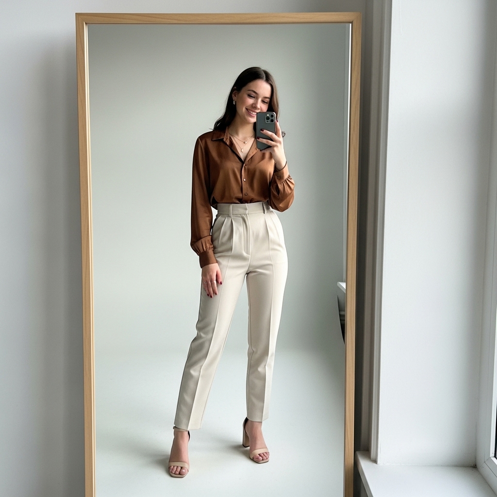 A silky brown blouse tucked into cream trousers creates a chic office-ready outfit. Add heeled loafers and a beige blazer for a sophisticated layered look. This is ideal for women who want timeless style in professional settings.