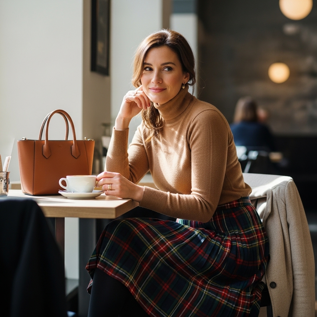 A camel turtleneck paired with a plaid skirt creates a preppy fall vibe. Pair with tights, loafers, and a structured bag for a polished touch. This outfit is classy, cute, and perfect for everyday wear.