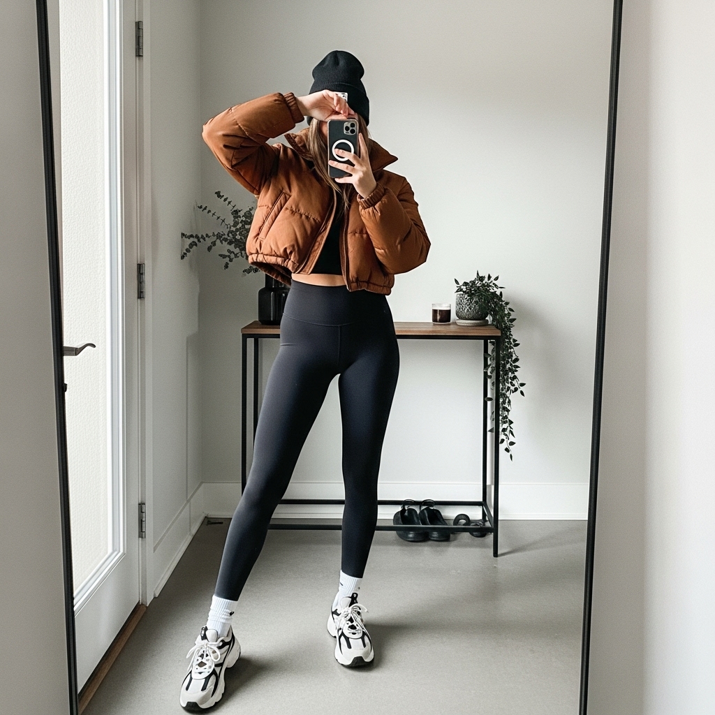 A cropped brown puffer jacket with black leggings makes a sporty, casual fall look. Add chunky sneakers and a baseball cap for athleisure energy. Ideal for errands, casual strolls, or travel days.