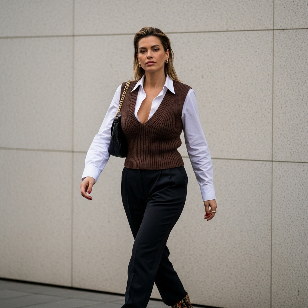 A brown knit vest layered over a crisp white shirt is chic and trendy. Pair with tailored trousers or jeans depending on the vibe. Add loafers or boots to finish. This layered look is classic with a modern twist.
