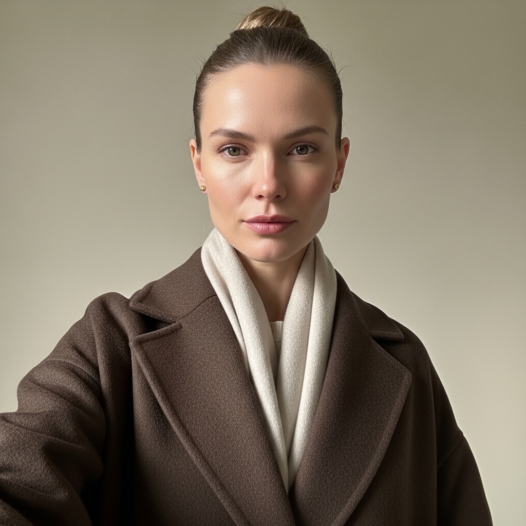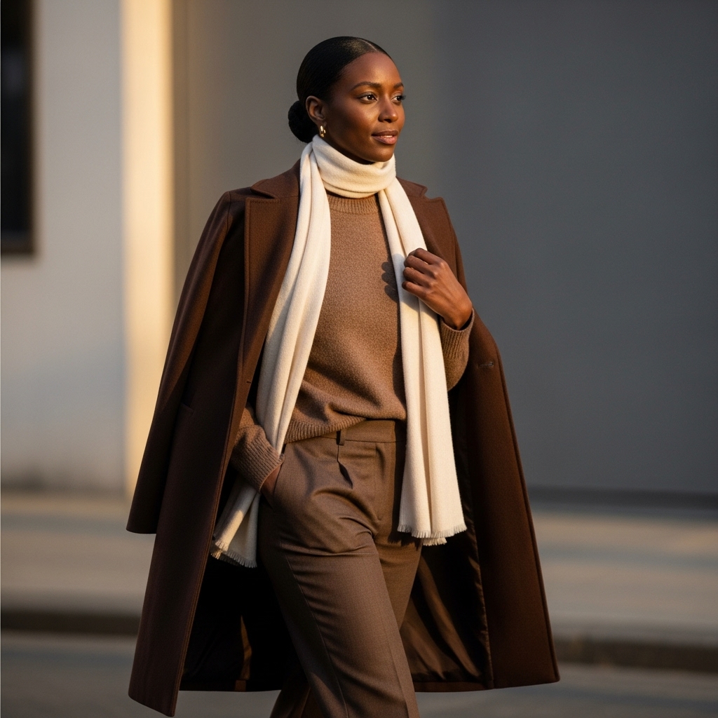 16. Dark Brown Coat with Neutral Scarf