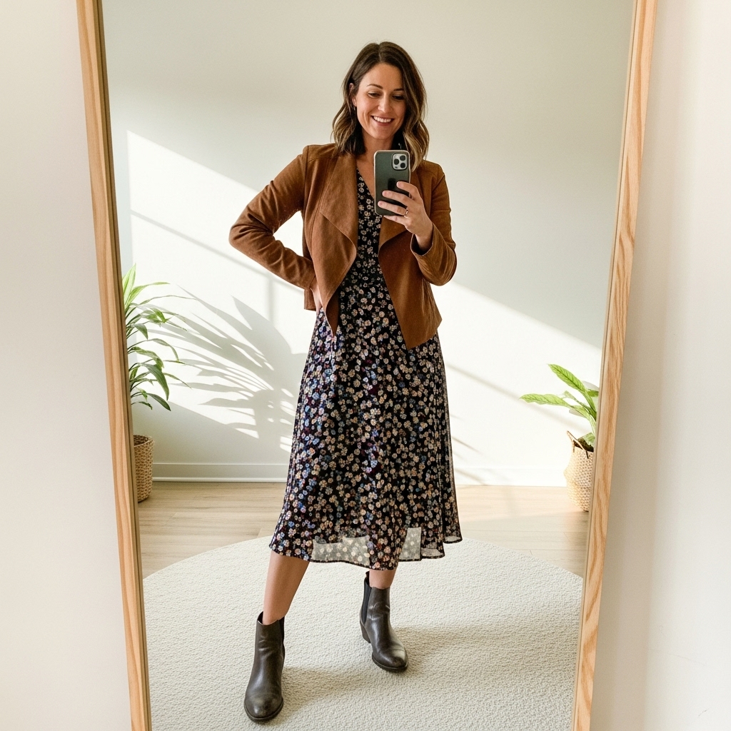 A brown suede jacket paired with a floral or solid-toned dress makes a feminine yet chic fall outfit. Add ankle boots to balance softness with structure. This look works perfectly for casual dinners or fall strolls.