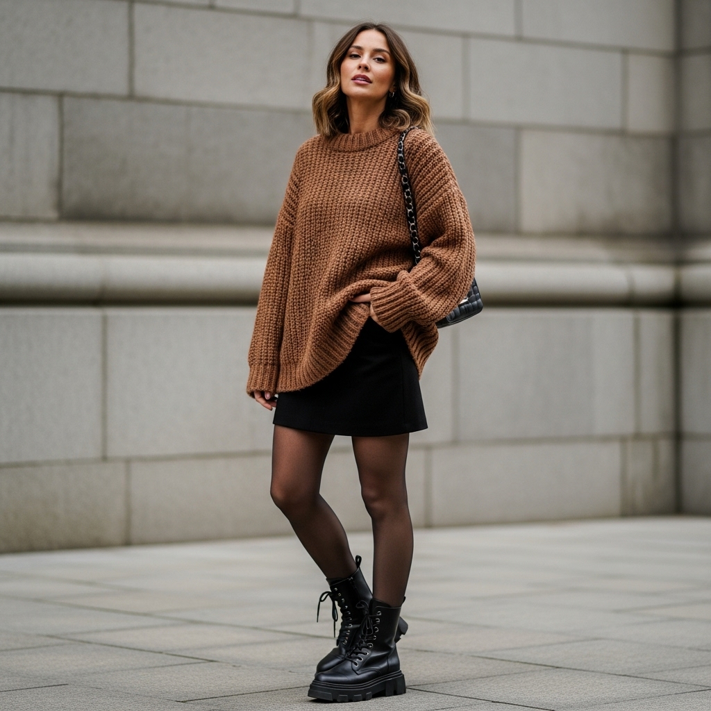 An oversized brown sweater tucked slightly into a mini skirt is cozy yet flirty. Pair with tights and chunky boots for a Pinterest-worthy look. Great for younger women wanting bold but cute fall style.