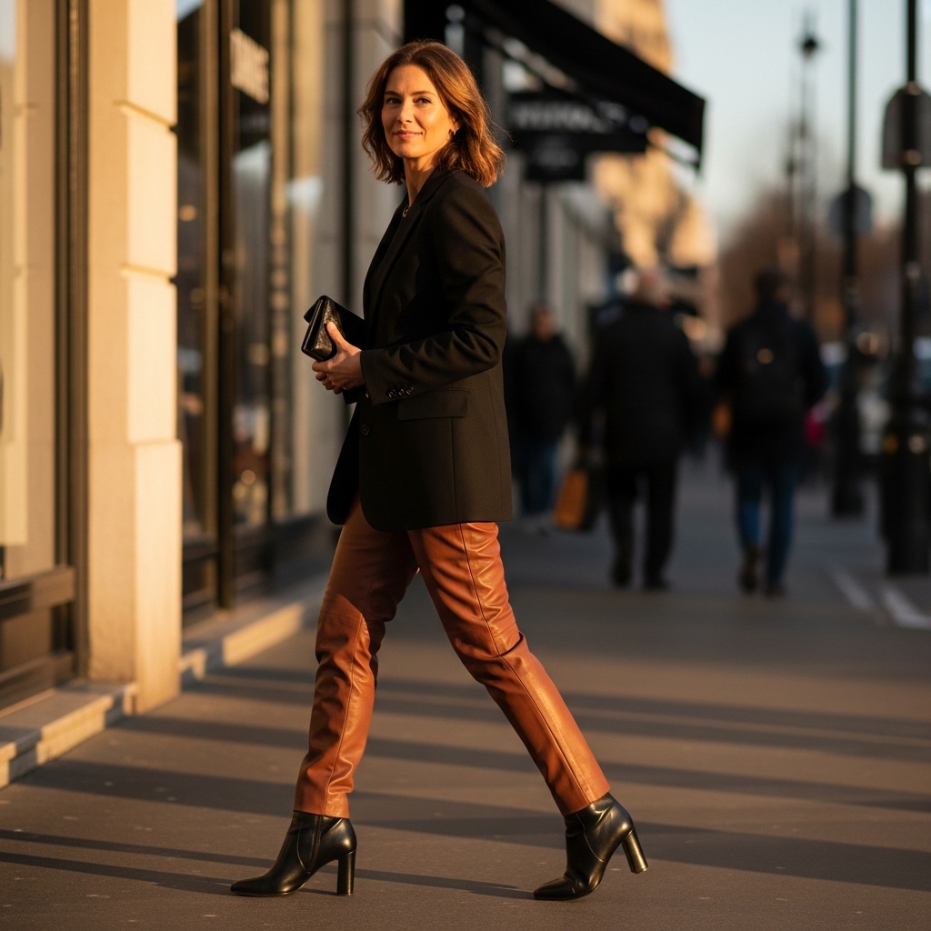 Brown leather pants paired with a sleek black blazer give edgy sophistication. Add heeled boots and a clutch for evening-ready style. This is perfect for women who want bold, confident fall outfits.