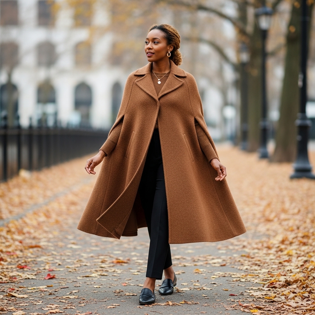 A cape-style brown coat layered over slim trousers creates dramatic, elegant style. Add loafers or heeled boots to balance proportions. This outfit screams sophistication and makes a statement in any setting.
