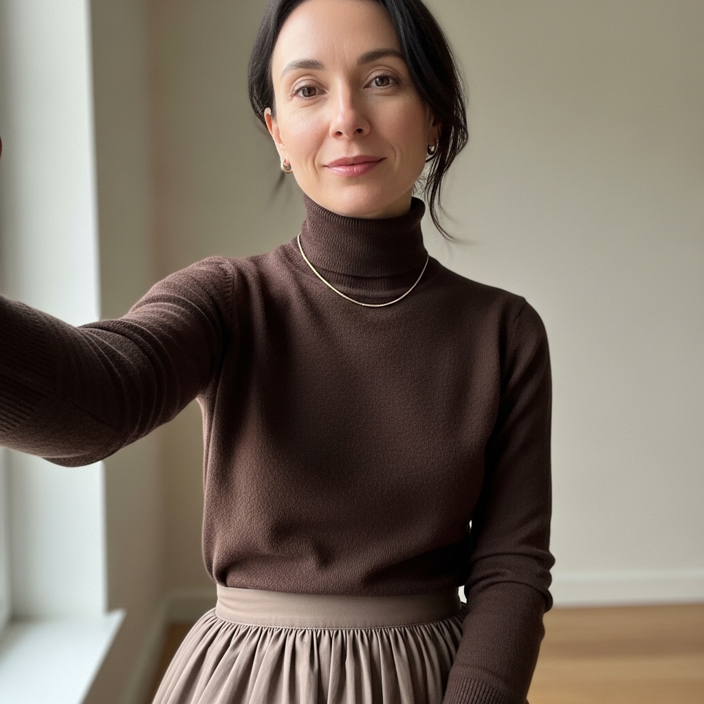 A chocolate brown turtleneck paired with a flowy midi skirt feels cozy yet feminine. Choose a skirt in lighter tones for contrast, like ivory or taupe. Add boots and gold jewelry for subtle elegance. This versatile combo is both comfy and chic.