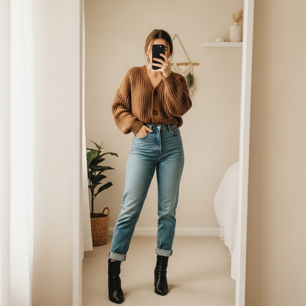 5. Brown Cardigan with High-Waist Jeans