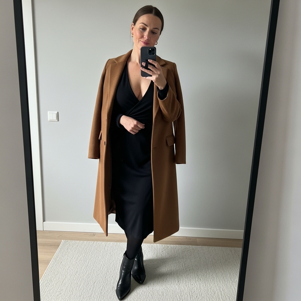 A tailored brown wool coat layered over a black dress gives contrast and polish. Add tights and heeled boots for extra warmth. This outfit is perfect for dinner dates or evening events where classy yet understated style is key.