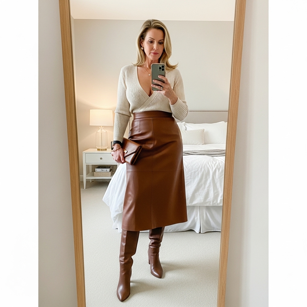 Pair a brown leather skirt with a cream or beige knit for an elevated fall outfit. Add knee-high boots for a fashionable finish. This chic combo is perfect for brunch with friends or city shopping days.