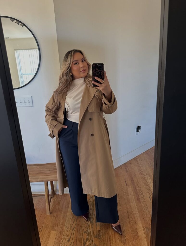 Classic, polished, and universally flattering, this combination embodies timeless business casual dressing. The camel trench coat adds heritage charm, while navy tailored trousers keep the look grounded in professionalism. Perfect for commuting, seasonal transitions, or days filled with meetings, this pairing ensures both comfort and sophistication from morning to evening.