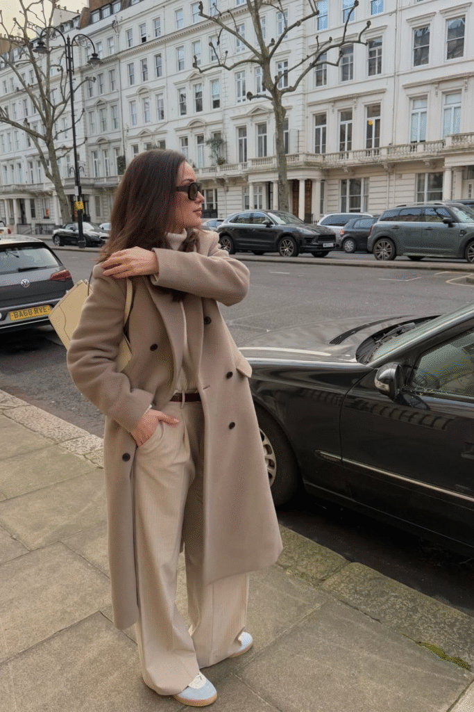 A camel wool coat brings timeless elegance to any business casual wardrobe, and when combined with navy pleated trousers, the result is both structured and refined. This look is perfect for cooler seasons when you want warmth without sacrificing style. It’s a great choice for office days, client meetings, or city commutes where layering matters. The contrast between camel and navy creates a classic palette, allowing you to feel confident, streamlined, and effortlessly chic.