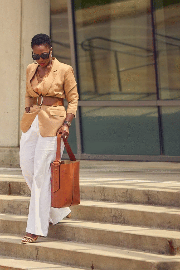 Warm cognac tones add a sense of richness to this business casual ensemble. The belted blazer enhances shape and structure, while the wide-leg trousers provide ease and movement. This outfit works beautifully for days when you want to appear put-together but relaxed. It’s especially fitting for transitional seasons and office environments that appreciate modern, fashion-conscious silhouettes.