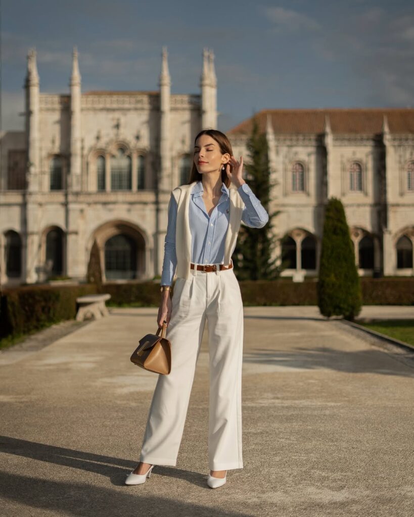 A striped poplin shirt adds freshness and movement, especially when matched with tailored ivory trousers. This combination exudes understated elegance and is suitable for both formal and semi-casual office settings. The crisp lines ensure structure, while the soft palette keeps the outfit approachable. It’s a comfortable yet elevated option for days with back-to-back meetings.