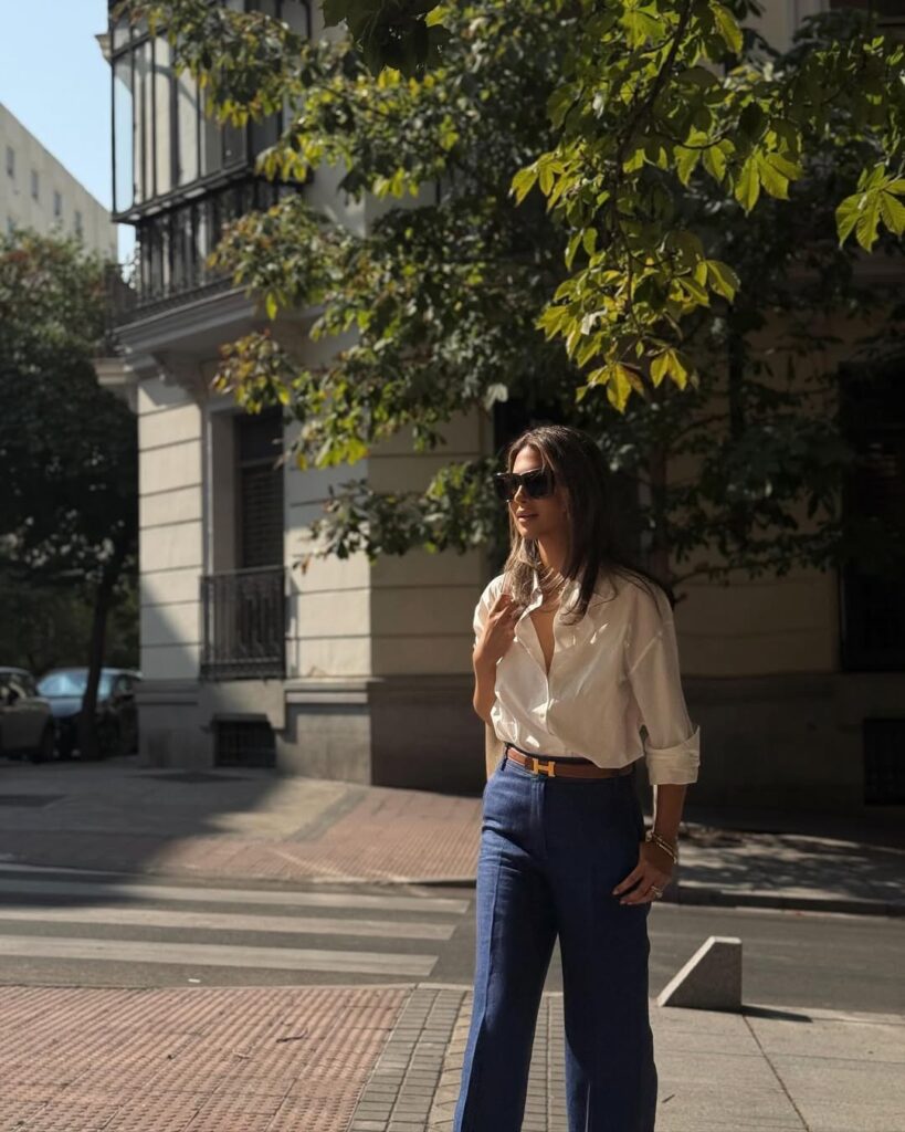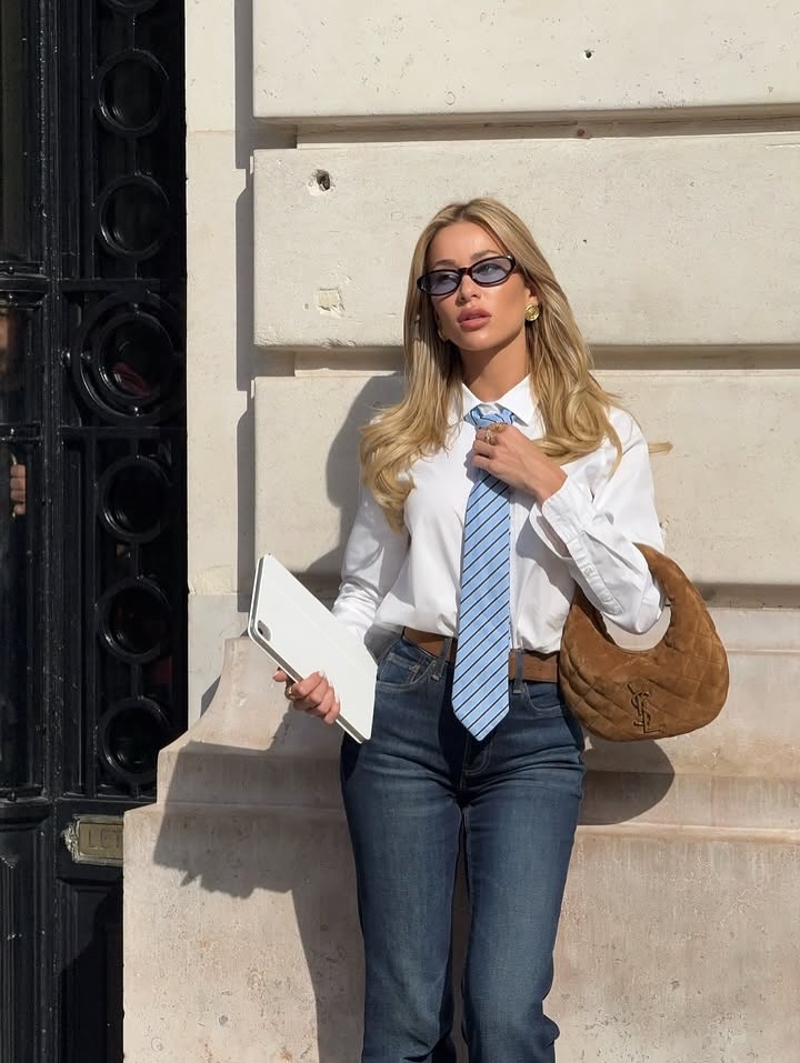 A fresh twist on business casual, this outfit blends traditional menswear-inspired touches with relaxed denim. The white button-down and sky-blue tie elevate the look, while the denim keeps it approachable and modern. This is a great choice for casual workdays, creative offices, or hybrid schedules where professionalism has room to breathe. It feels crisp yet comfortable all day long.