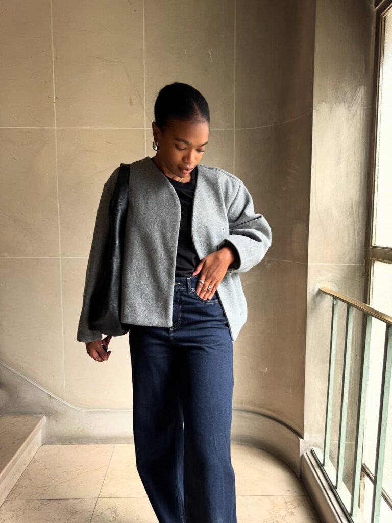 Monochrome layers create a sleek, streamlined effect, especially when paired with clean denim. This outfit is ideal for modern workplaces or days when you want a cohesive yet approachable look. The layered tones add depth without overwhelming, and the denim introduces everyday comfort. It’s stylish, easy, and perfectly balanced.