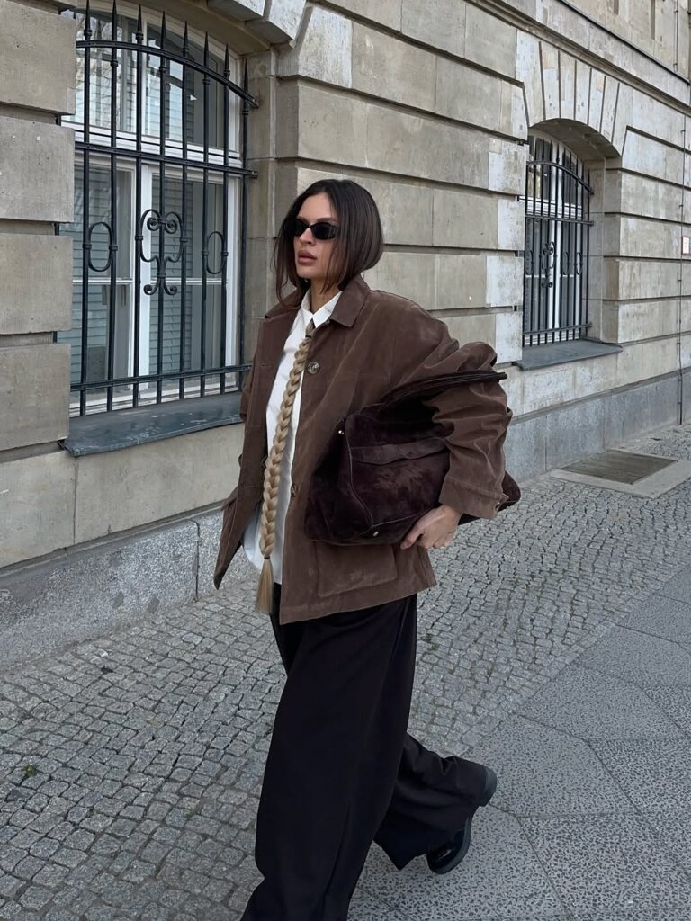 This outfit blends warm, earthy tones with classic tailoring for a polished yet cozy appeal. The chocolate suede jacket adds depth and texture, while the noir trousers bring structure and refinement. It’s ideal for fall workdays, business lunches, or informal team gatherings. The look feels grounded, stylish, and comfortably elevated.