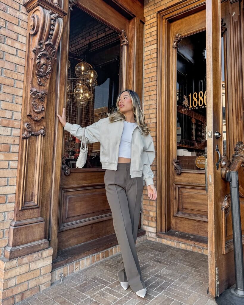 2. Cream Bomber Jacket with Taupe Tailored Trousers