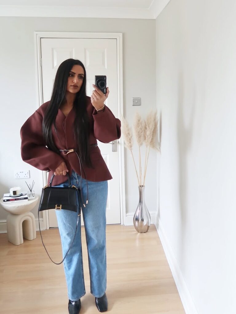 A belted wine-toned jacket adds a touch of luxury, while everyday denim keeps the outfit grounded and wearable. It’s a perfectly balanced ensemble for office environments that allow curated casual wear. The belt’s structure adds shape, giving the whole look an elegant silhouette. It works well for both afternoon meetings and relaxed evening plans.
