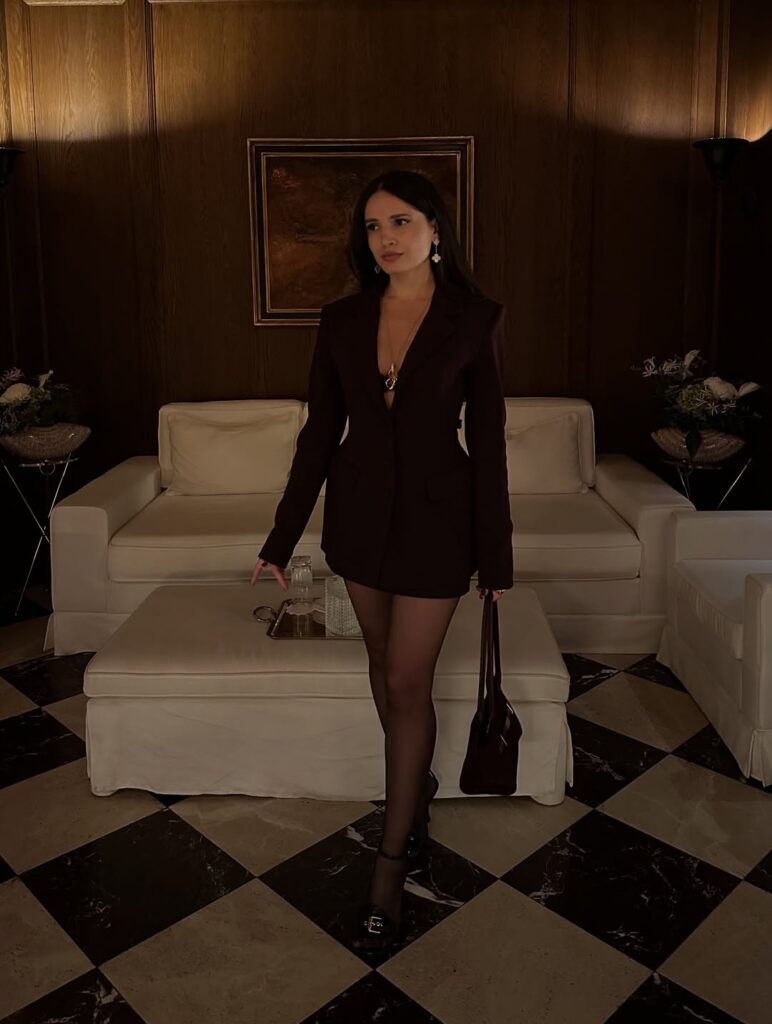 The blazer dress is a bold take on business casual, and in burgundy, it becomes even more striking and refined. Sheer noir tights add subtle depth, creating a balanced blend of power and polish ideal for work events, conferences, or styled office days. This outfit delivers confidence without compromising comfort, allowing you to move freely while maintaining a strong professional image.