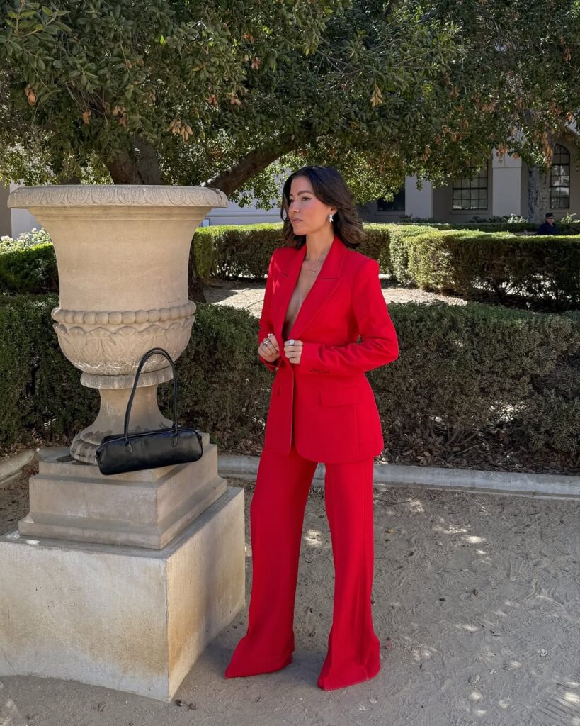 Bold and powerful, this red monochrome suit is designed for moments when you want to make a strong impression. The elongated lines create height and structure, while the monochrome palette ties the entire look together. Ideal for presentations, leadership roles, or days you want to feel empowered, the outfit blends confidence with classic tailoring.