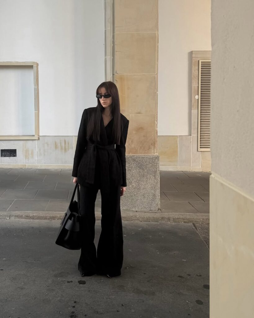 A belted blazer in midnight tones paired with flared tailored trousers creates a powerful yet sophisticated silhouette. It elongates the frame while highlighting a structured waistline, making it excellent for leadership roles, presentations, or days you want to embody authority with style. Despite its sharp details, the outfit remains comfortable and wearable, thanks to the clean tailoring and smooth fabric flow.