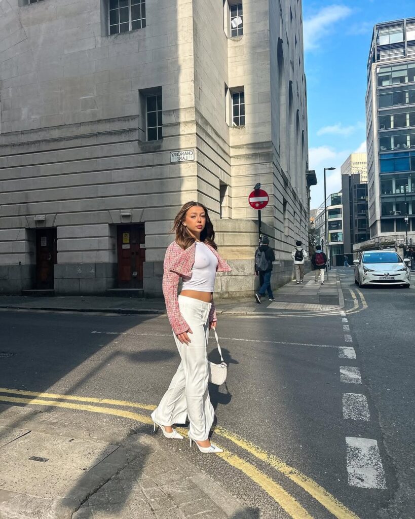 Boucle brings rich texture to this refined business casual look. Layered over minimal whites, it creates a soft, polished aesthetic ideal for client-facing roles or days when you want a more fashion-forward presence. The textures harmonize beautifully, offering comfort and sophistication while still feeling modern and thoughtfully curated.