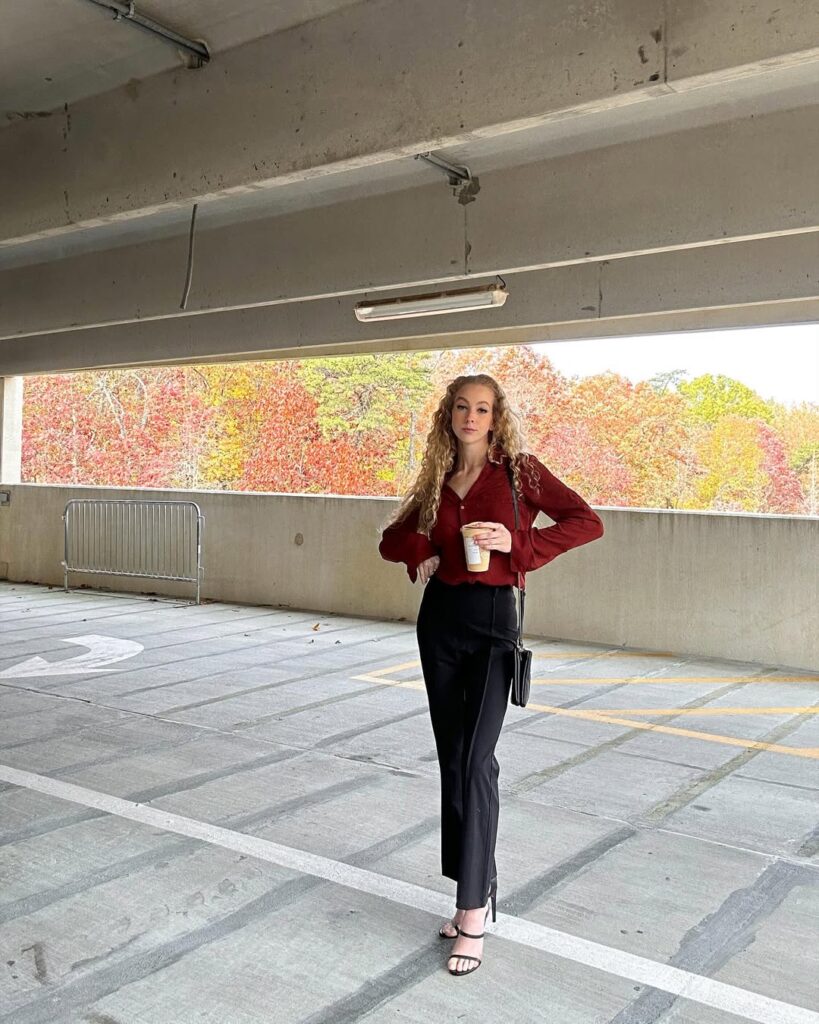 9. Burgundy Silk Blouse with Black Tailored Trousers