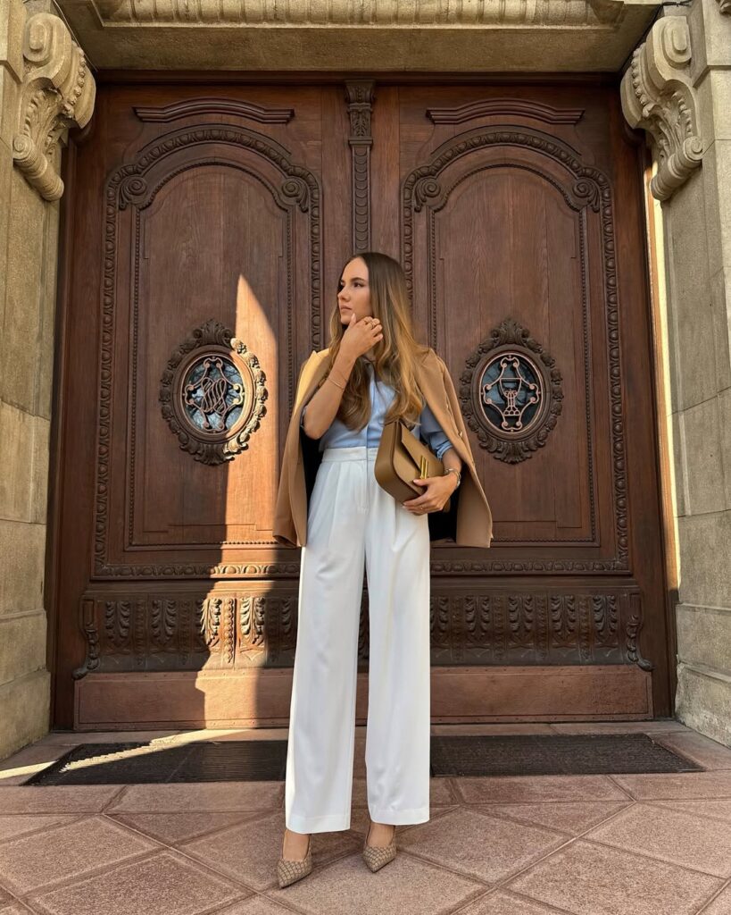 Graceful and luxuriously soft, this combination focuses on fluid lines and gentle contrasts. The camel draped blazer introduces movement, while ivory tailored trousers maintain crisp sophistication. This look suits professional settings where elegance and subtlety matter. It’s lightweight, comfortable, and ideal for long workdays that require effortless transitions.