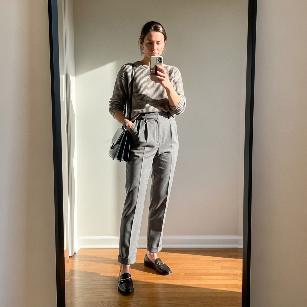 A classic pairing that never fails: a cozy neutral sweater tucked into tailored trousers. Add loafers or ankle boots for office polish. This look strikes the balance between comfortable and professional, making it perfect for casual Fridays.