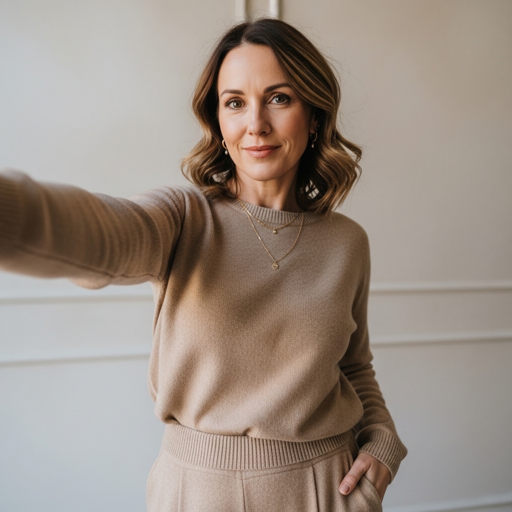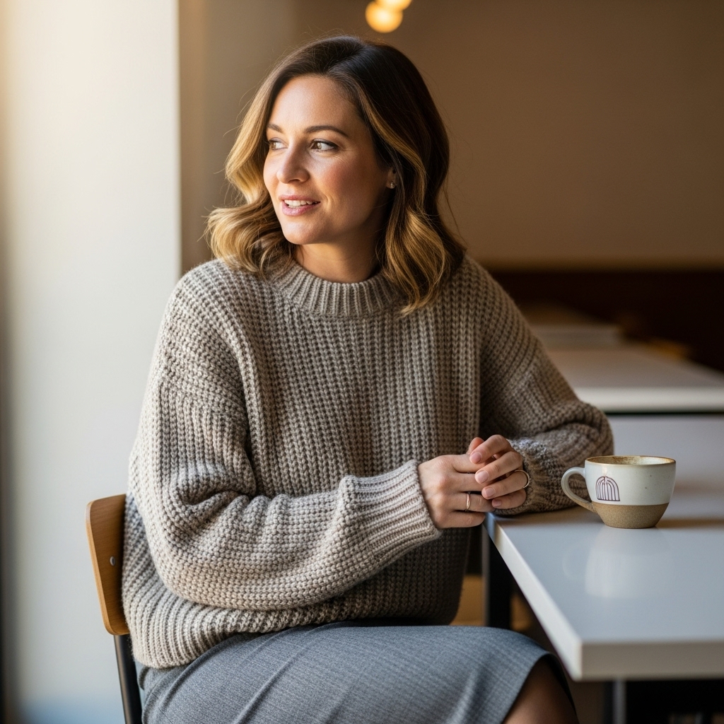 A matching knit set in beige or taupe is cozy and professional. Pair with pointed flats or boots and add minimal jewelry. It’s an effortless outfit that feels luxurious.