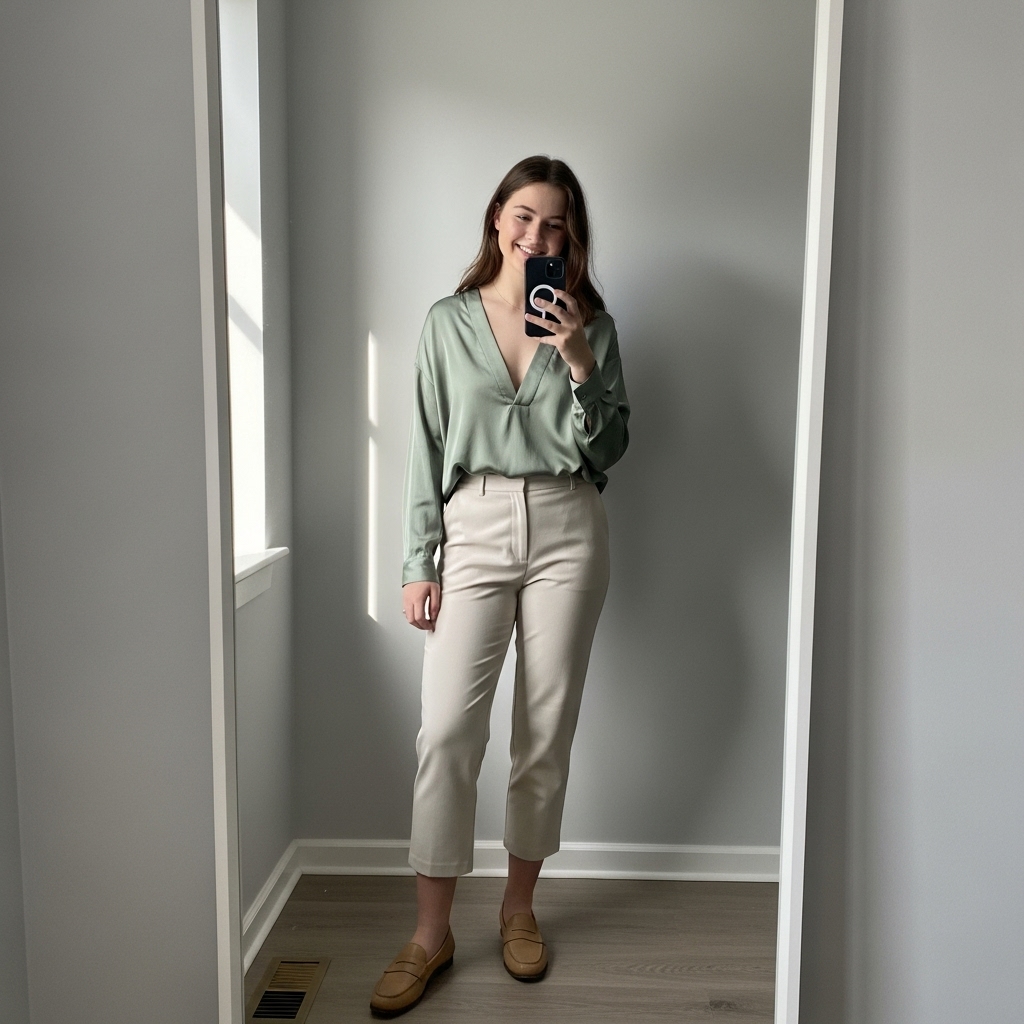 A relaxed blouse paired with cropped trousers creates a polished but approachable look. Add ballet flats or low heels. Perfect for women who prefer lightweight outfits in the early fall.