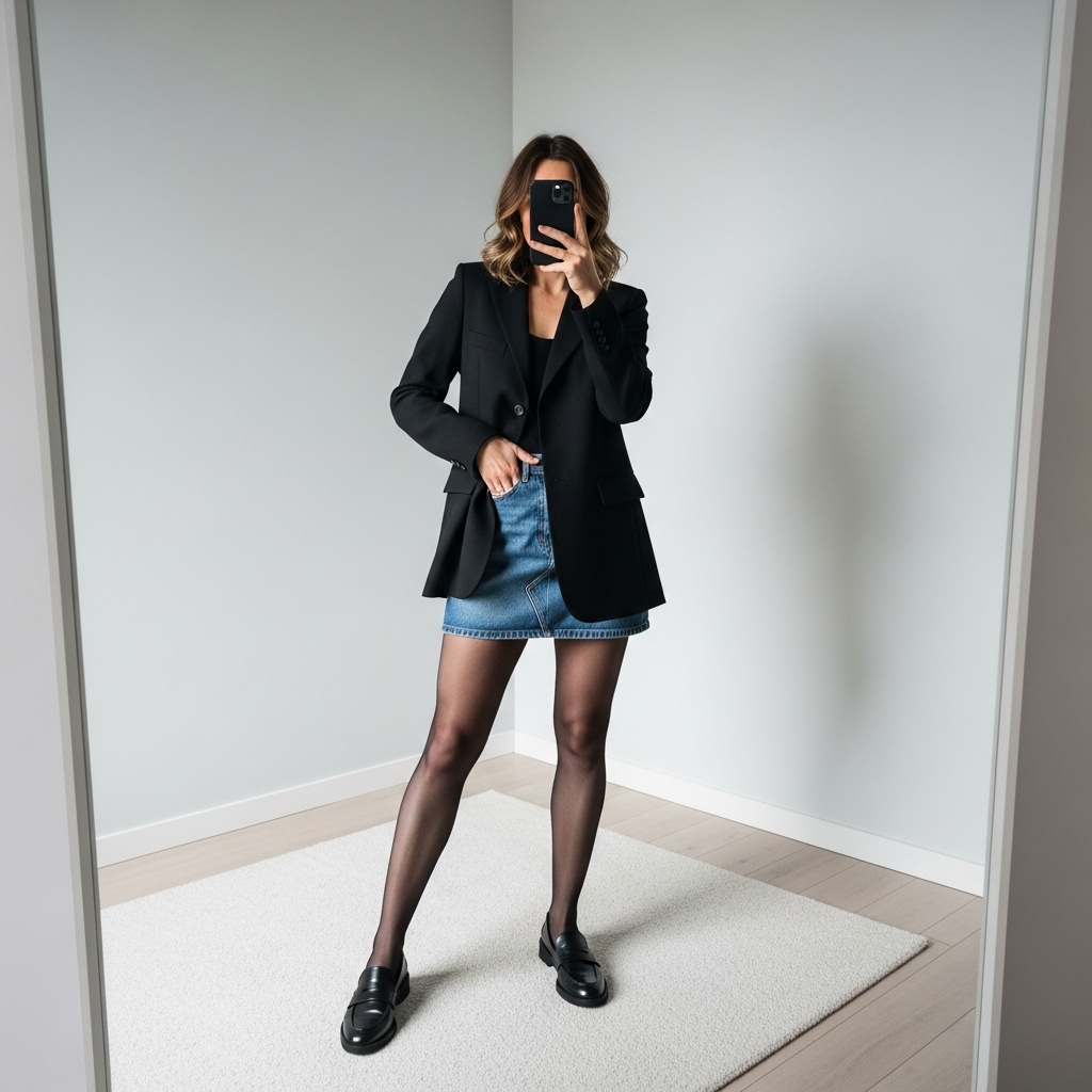 For a laid-back but stylish office look, pair a denim skirt with a structured blazer. Add tights and loafers for warmth. A casual but chic option for creative workplaces.