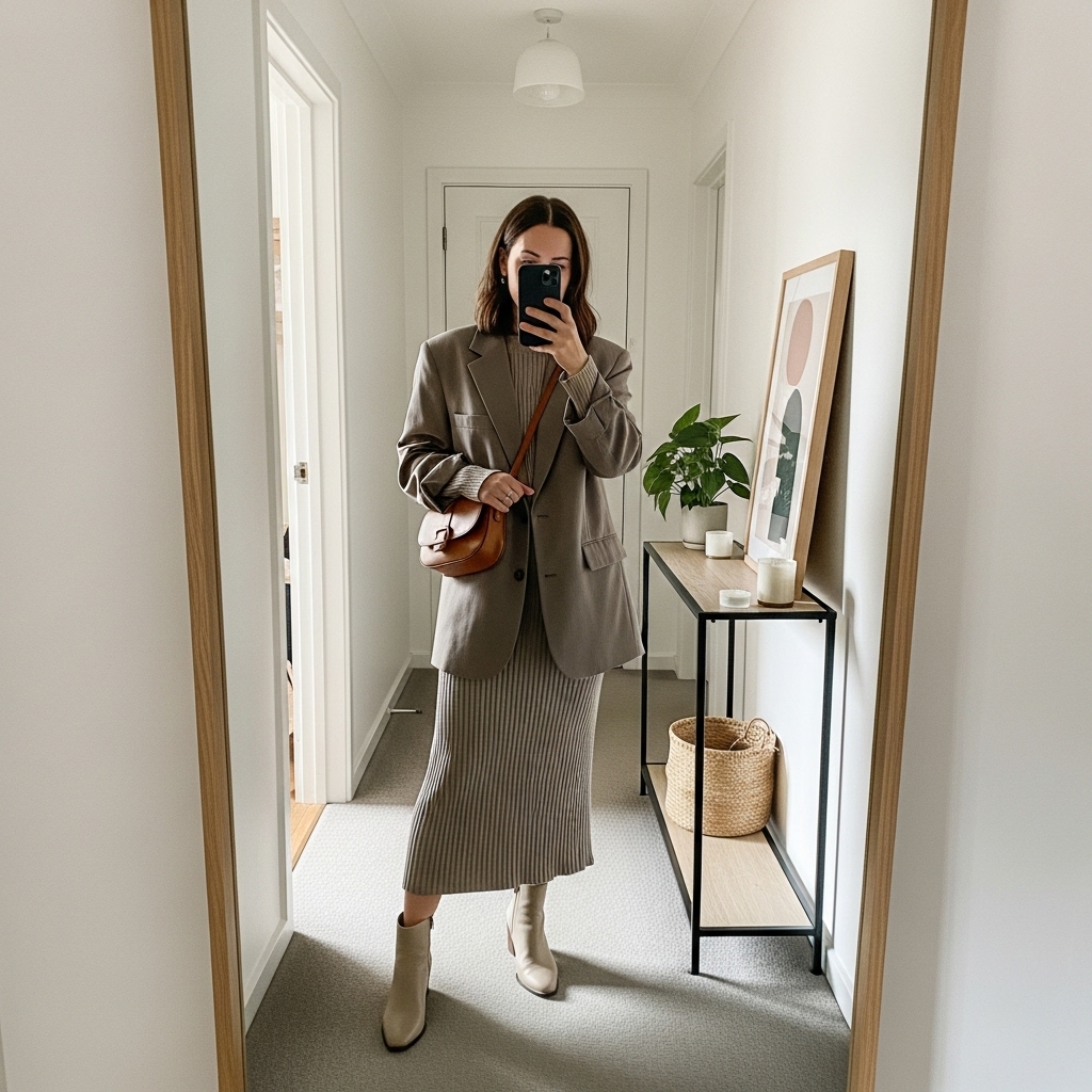 Layer a casual blazer over a ribbed knit skirt and fitted top. Add booties for polish. This outfit blends comfort with structure, making it ideal for business casual workplaces.