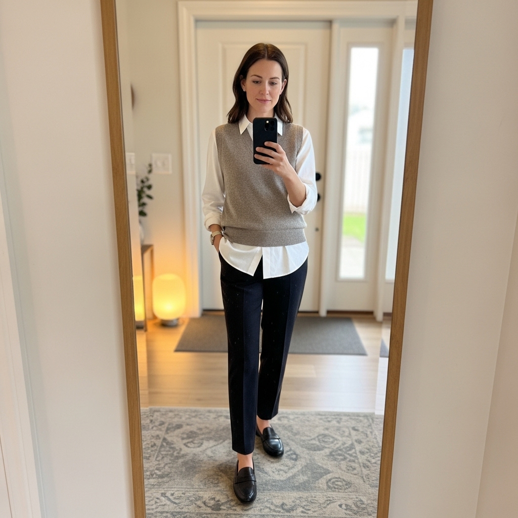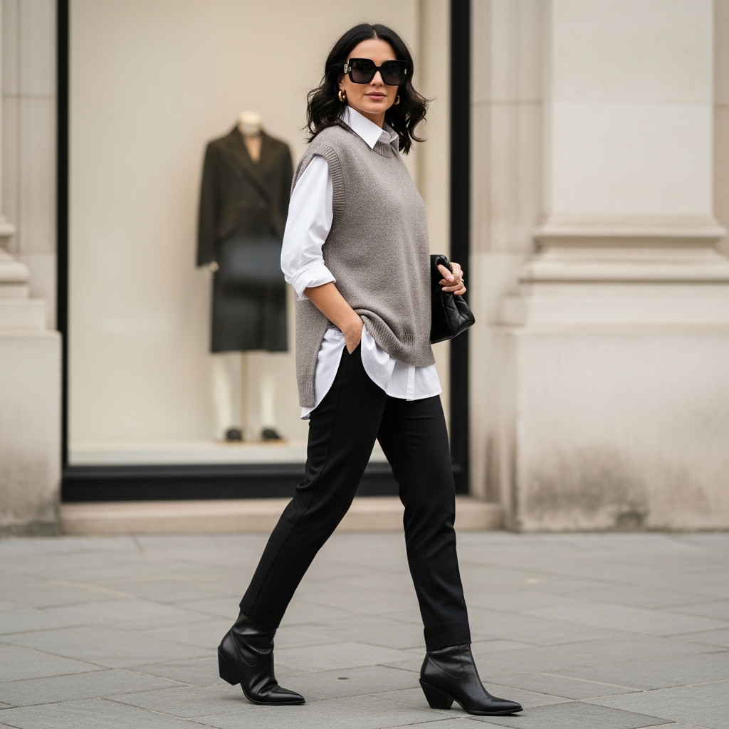 Layer a sweater vest over a white button-down shirt and trousers. It’s cozy yet smart and a great nod to fall layering. Add loafers for a chic office-ready outfit.