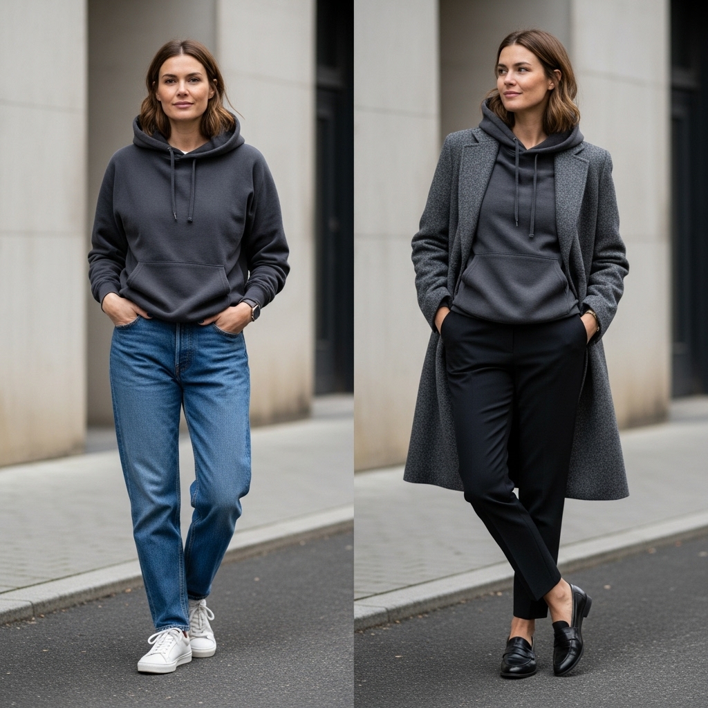 Mix cozy with classy by layering a hoodie under a tailored coat. Style with slim trousers and sneakers for a relaxed office look that still feels pulled together.