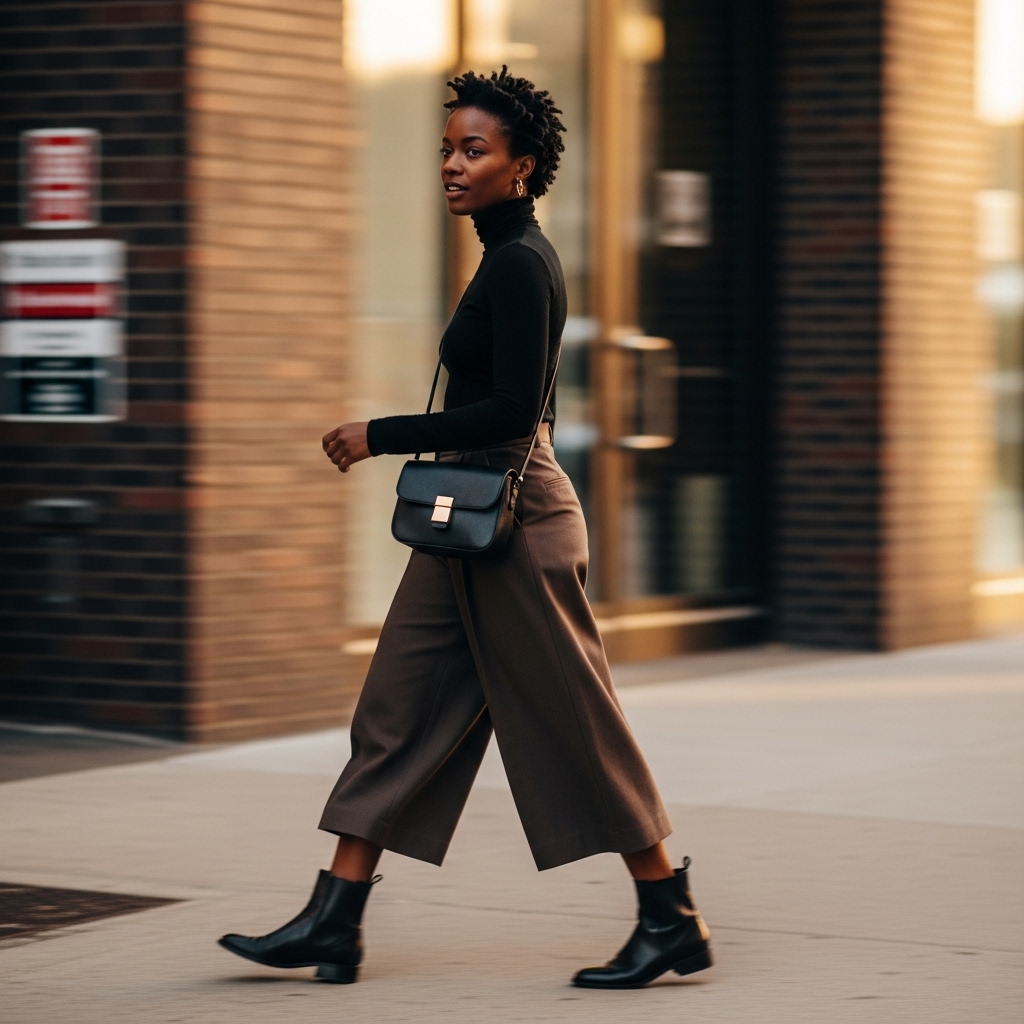 A slim turtleneck paired with wide-leg culottes is modern and chic. Add ankle boots to elongate your silhouette. This outfit feels comfortable yet polished, perfect for creative or casual office settings.