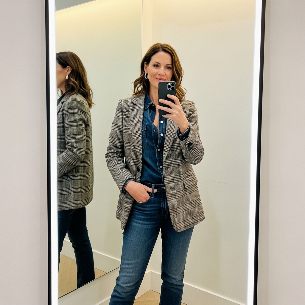 A plaid blazer layered over denim jeans and a neutral knit is classic fall fashion. Add ankle boots for structure. This outfit is casual yet stylish enough for most workplaces.