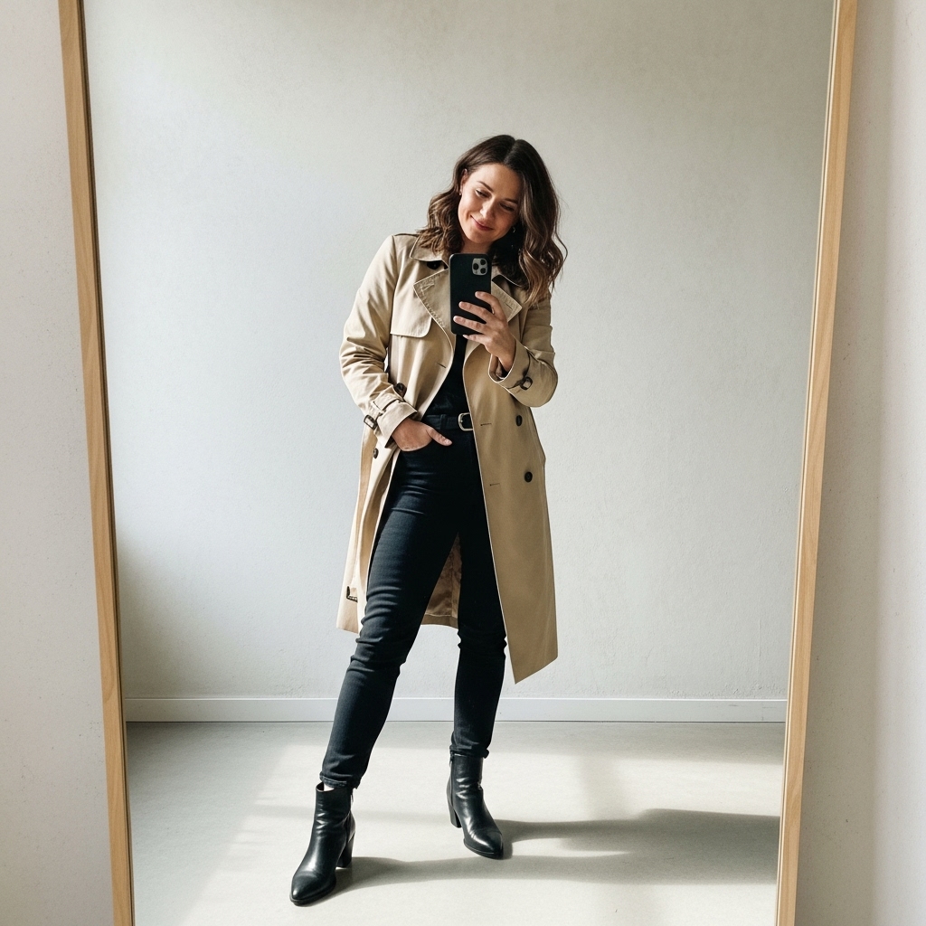 Nothing says city chic like a beige trench coat paired with black ankle boots. Style it with dark denim and a fitted turtleneck for a timeless fall look. Add a crossbody bag to keep your hands free while walking through busy streets. This outfit is functional, polished, and ideal for those crisp urban mornings.