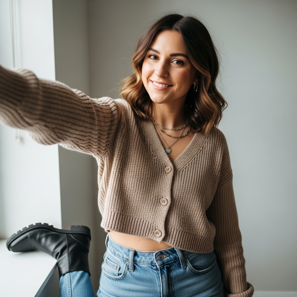 A cropped cardigan styled with high-waist jeans creates a chic, youthful city look. Add ankle boots and a structured crossbody for a polished touch. This outfit feels casual yet trendy, perfect for afternoon coffee dates or shopping runs. Gold hoops and layered necklaces can elevate this cozy fit instantly.