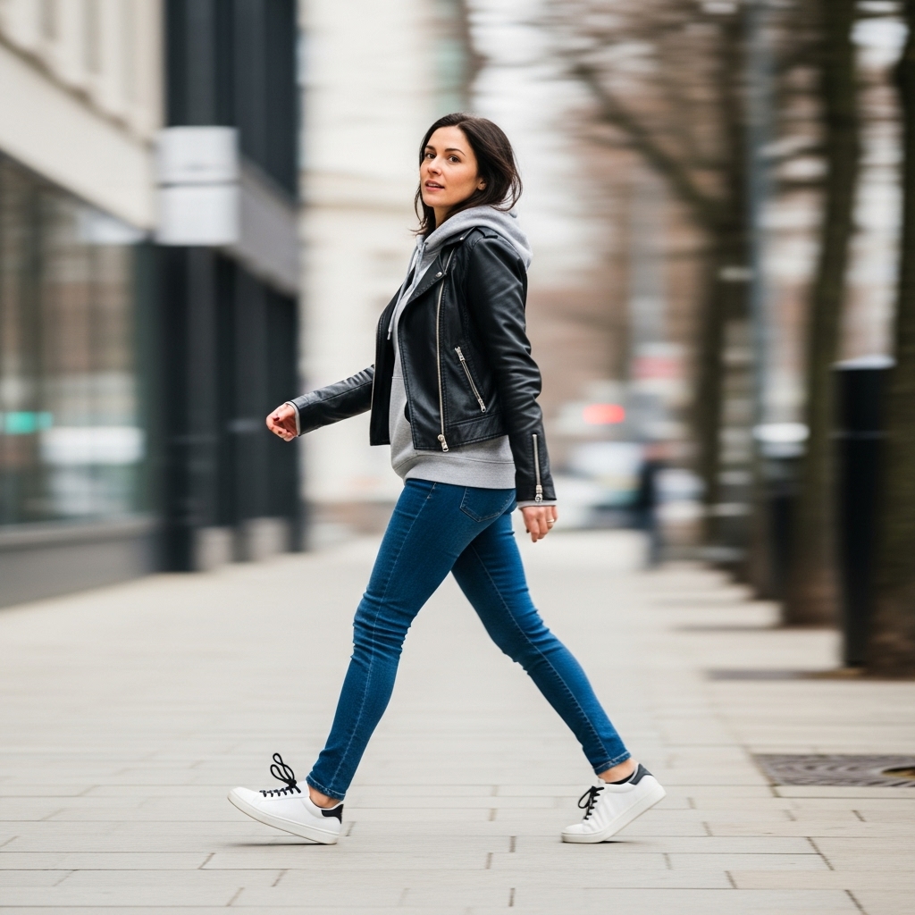 Layer a hoodie under a classic black leather jacket for a street-style inspired city look. Pair with slim-fit jeans and sneakers to keep things casual yet edgy. This outfit is perfect for coffee runs, casual dinners, or evening walks in the city. A baseball cap or sunglasses adds an urban edge.