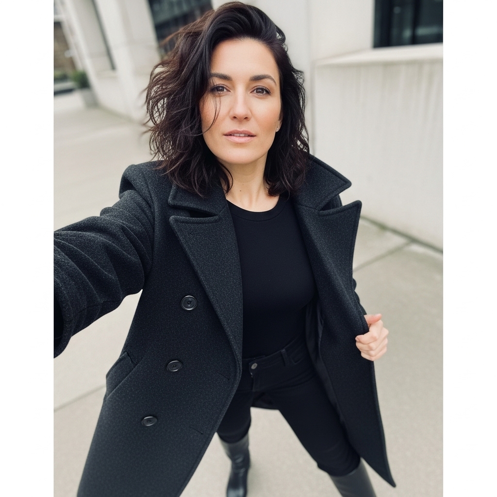 Elevate your city style with a double-breasted wool coat worn over a monochrome outfit. Black-on-black with heeled boots feels sleek and powerful. This polished ensemble is perfect for office days or chic dinner plans. Add a statement handbag to break the monotony and draw attention.